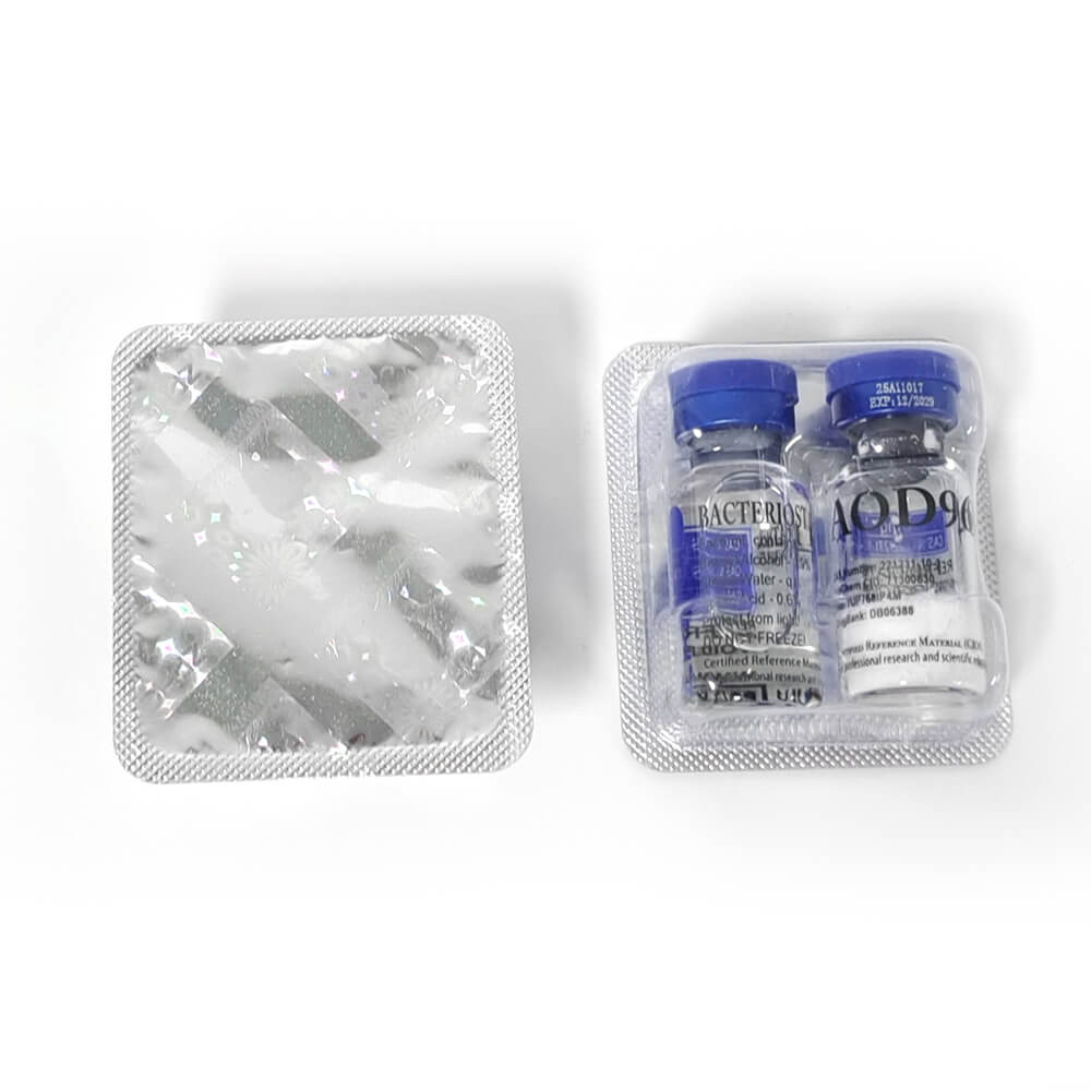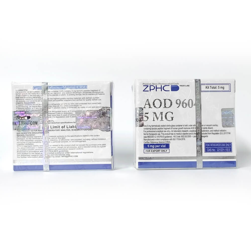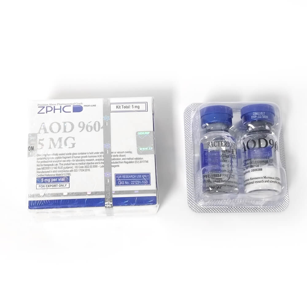 - Kit includes: 1 vial 5mg lyophilized AOD 9604 peptide + 1 vial bacteriostatic water for reconstitution.